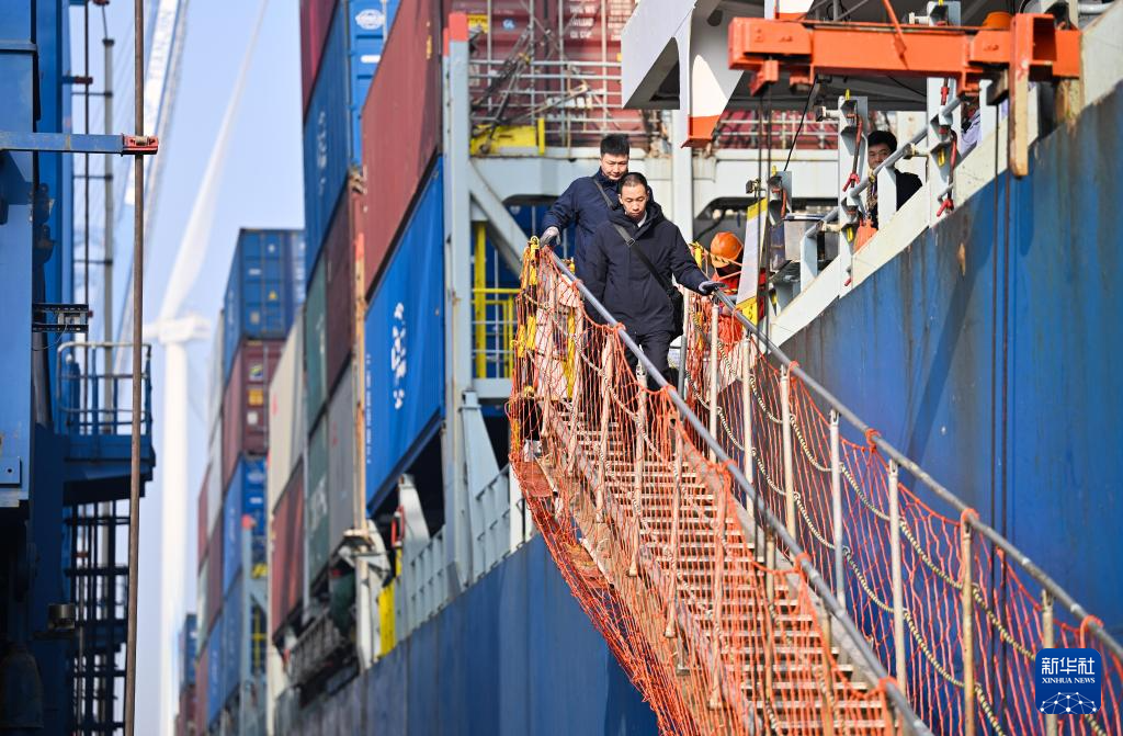2月4日,一艘集装箱货轮准备靠泊在天津港集装箱码头。