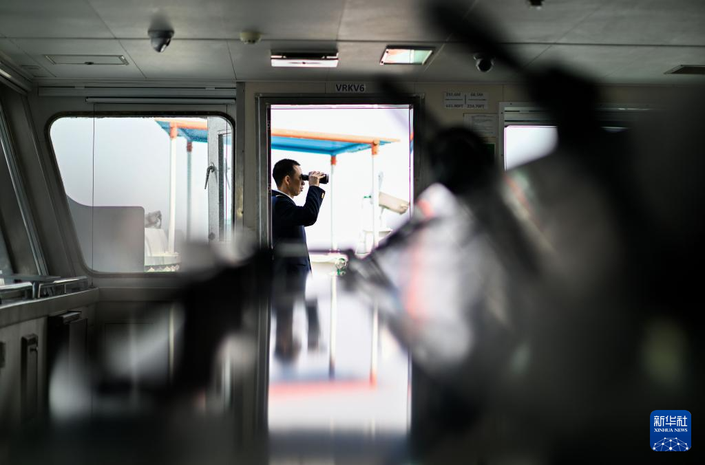 2月4日,天津港引航中心引航员许钦平在“中远海法”轮上通过望远镜查看航道。
