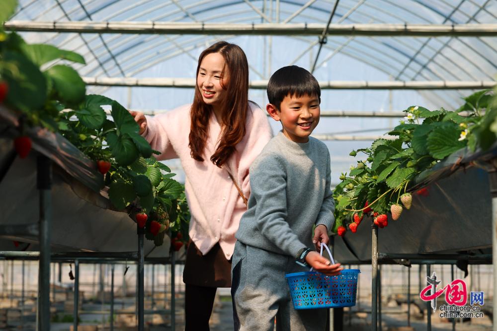 2月4日,游客在滕头村农创中心采摘草莓。滕头村多年来秉持“生态立村”的理念,大力发展生态农业、生态林业、休闲农庄、生态文化村、生态旅游村,把农村丰富的生态资源转化为农民致富的绿色产业,走生态立村、生态致富的路子。中国网记者 董宁 摄影
