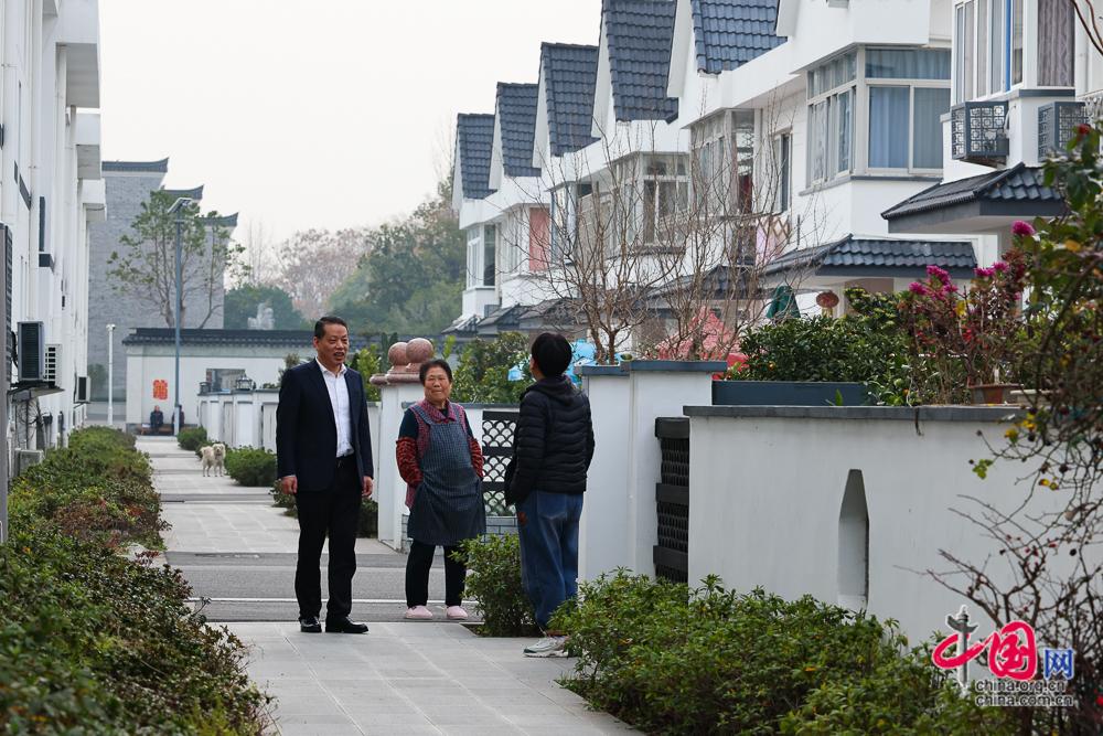 2月5日,滕头村党委书记、村委会主任傅平均(左)和小康社区的居民交流,征求村民意见。“未来三年,我们村产值一定要突破200亿元。”关于未来,傅平均信心满满。 中国网记者 董宁摄影