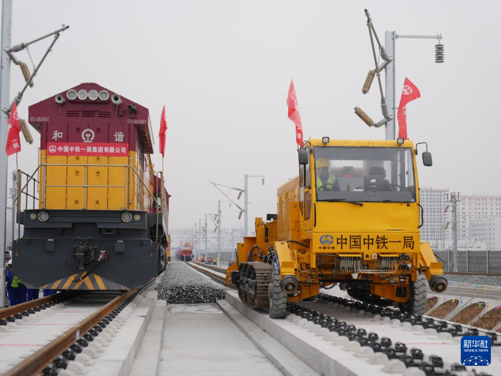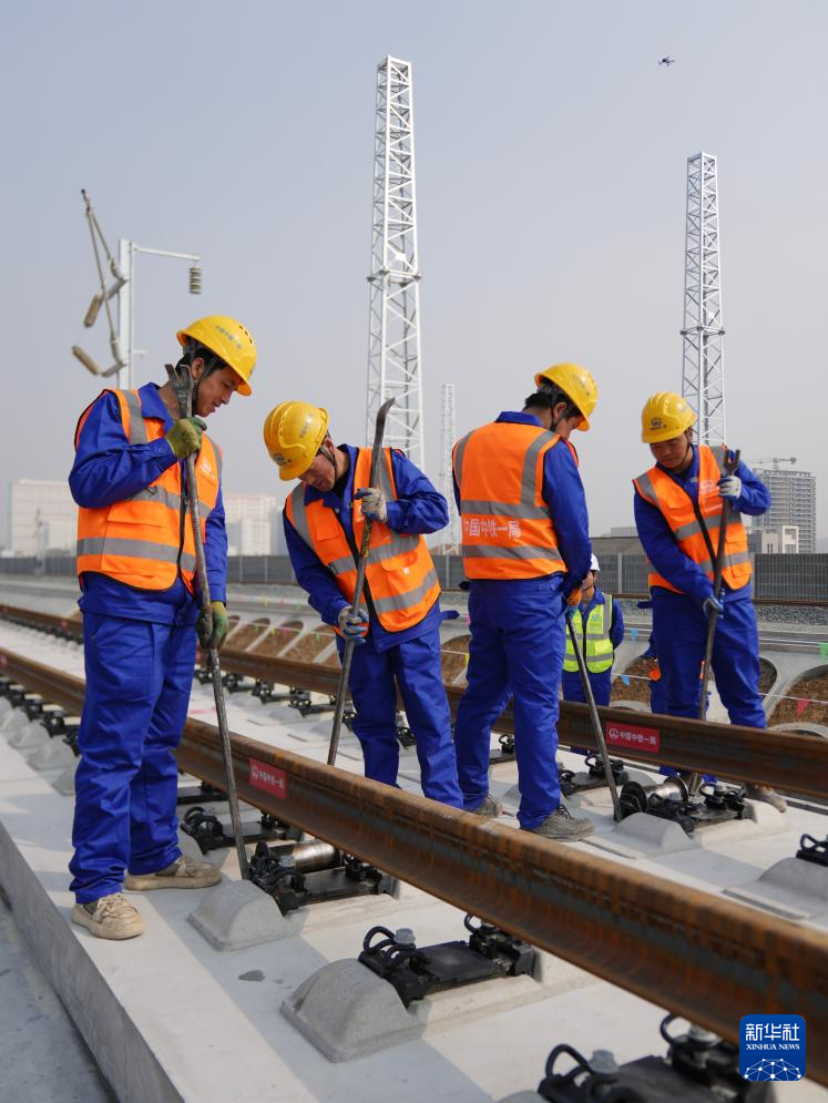 2月6日,中铁一局施工人员操作设备在西康高铁安康西站段铺设无缝钢轨。