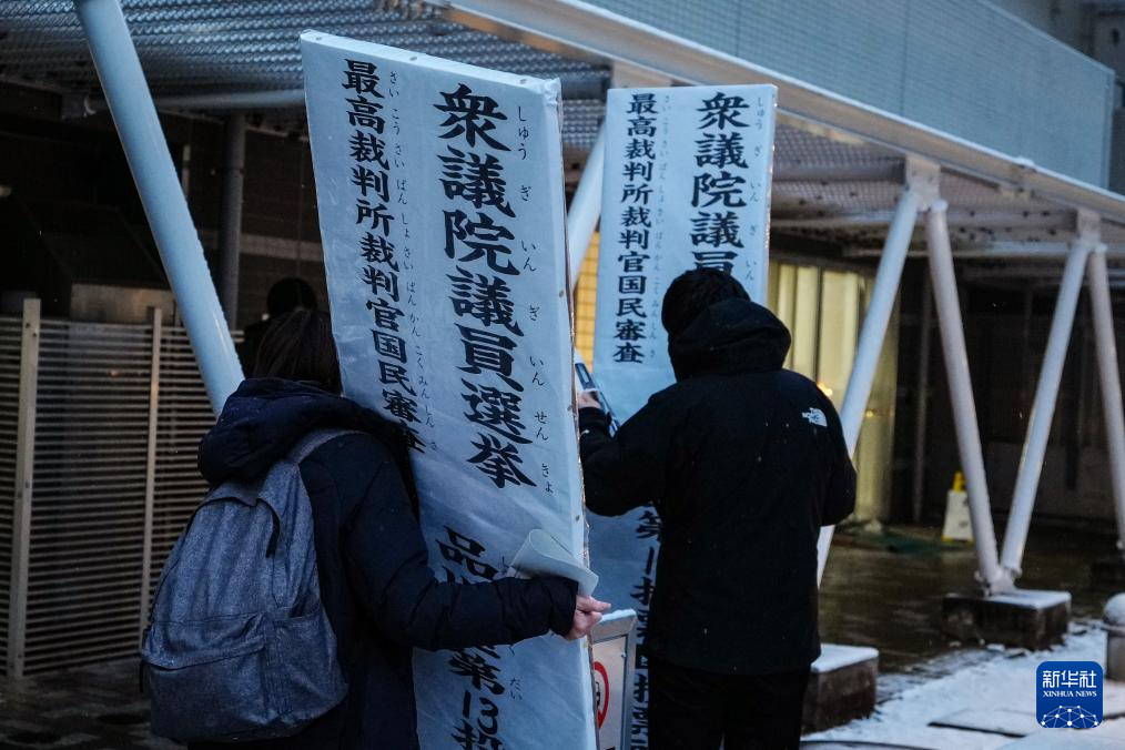 2月8日,在日本东京,工作人员在一处投票站外放置投票站标志。