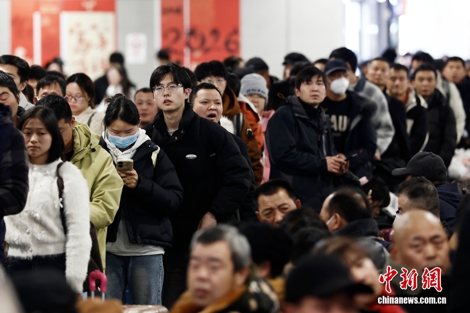 2月8日,来自中国交通运输部的数据显示,自2月2日起,2026年春运已满一周。春运首周,预计全社会跨区域人员流动量累计141322.7万人次,日均20189万人次,比去年同期增长2.0%。图为2月8日晚,旅客在铁路上海站候车大厅排队验票上车。