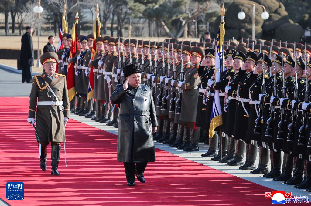 2月8日,朝鲜劳动党总书记、国务委员长金正恩检阅朝鲜人民军仪仗队。