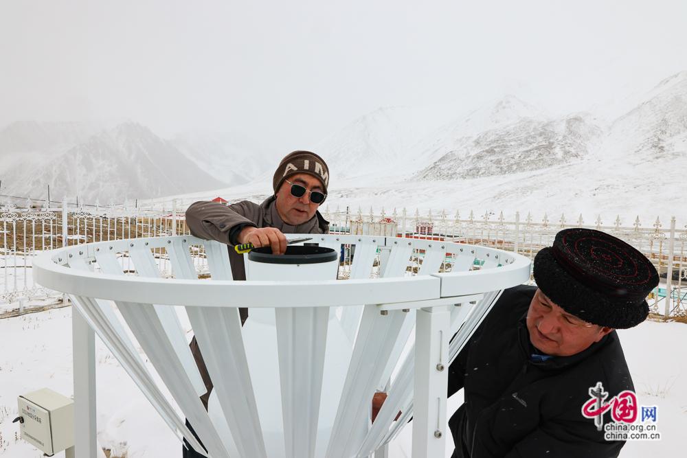 2月10日,塔县气象局工程师热孜克·胡吉和预报员那斯尔江·帕塔尔(左一)冒雪在红其拉甫国家气象观测站检修维护气象设备。中国网记者 董宁 摄影