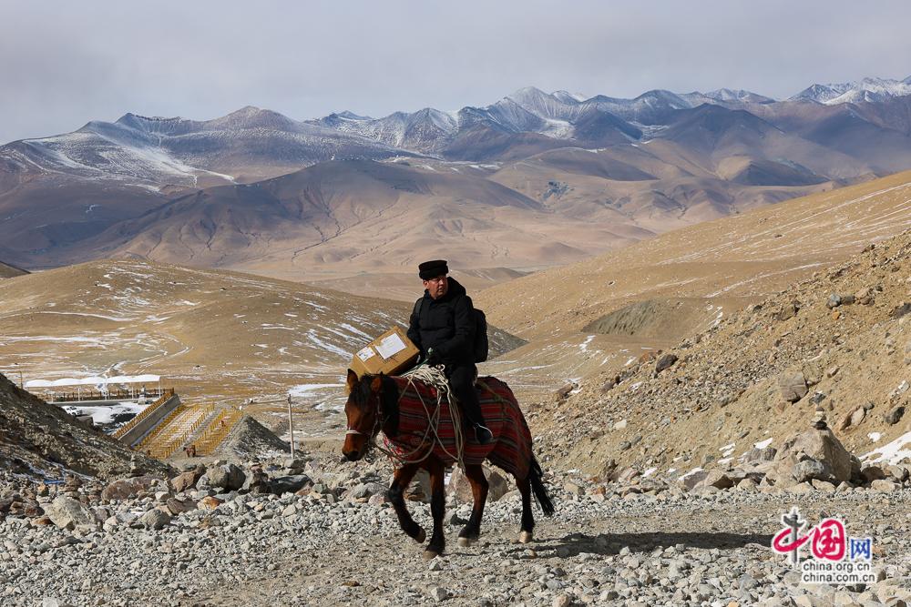 2月11日,塔县气象局观测员吾曲坤·吾守尔携带检测维修设备骑马前往慕士塔格冰川公园应用气象观测站。中国网记者 董宁 摄影