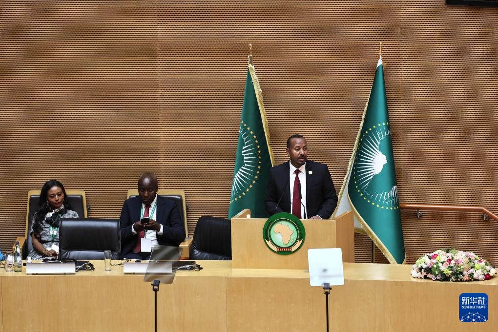 2月14日,在埃塞俄比亚首都亚的斯亚贝巴的非盟总部,埃塞俄比亚总理阿比(右一)在开幕式上致辞。
