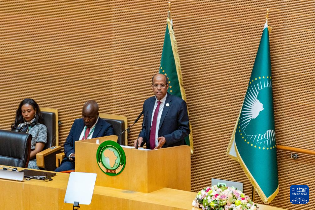 2月14日,在埃塞俄比亚首都亚的斯亚贝巴的非盟总部,非盟委员会主席优素福(右一)在开幕式上致辞。