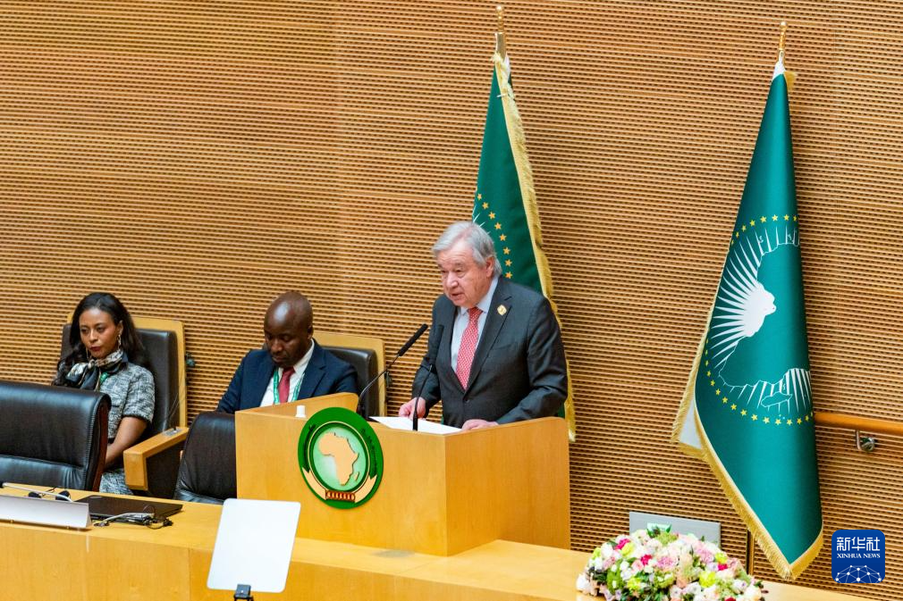 2月14日,在埃塞俄比亚首都亚的斯亚贝巴的非盟总部,联合国秘书长古特雷斯(右一)在开幕式上致辞。