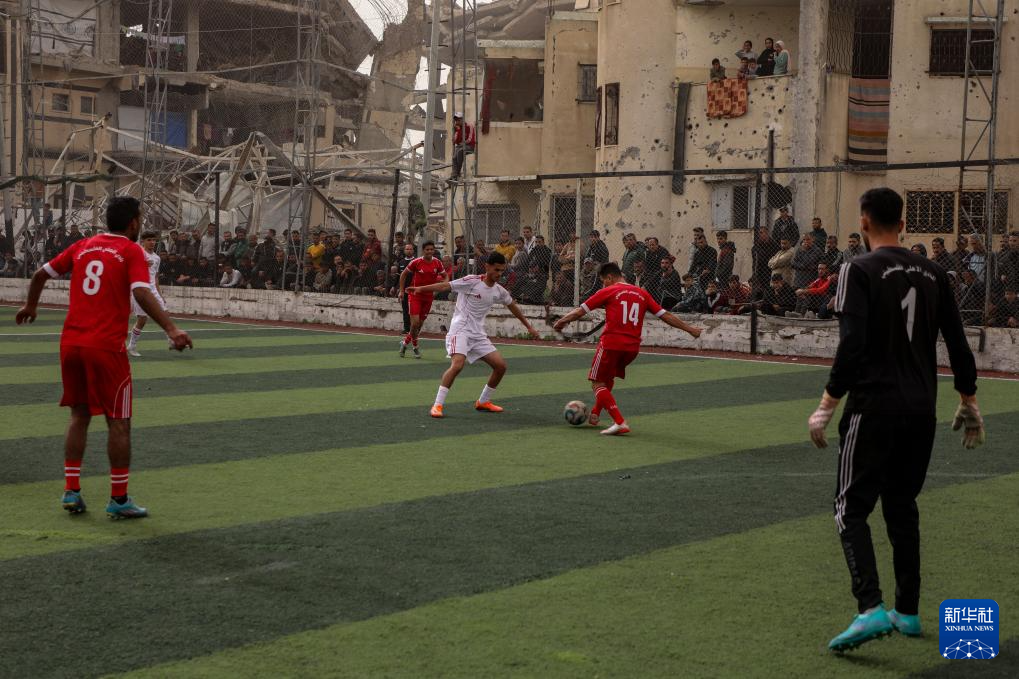 2月14日,在加沙城南部,当地民众在被摧毁的建筑废墟附近参加一场足球赛。
