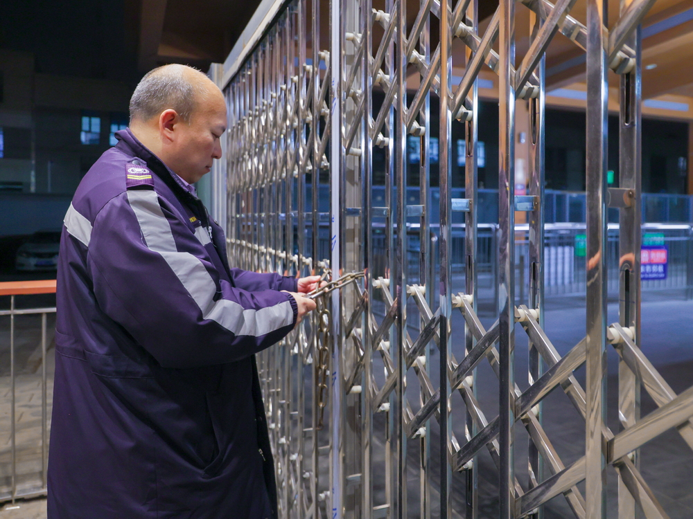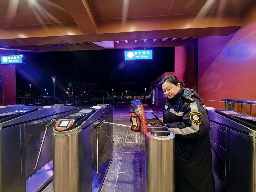 除夕22:30末班车发车前的最后时刻,站务员范杰开启应急门为即将来不及购票上车的乘客提供“先乘车 出站补票”的便利,把最后一位乘客平安送上车后协助进站口同事进行巴沟关站工作,关闭连廊门。