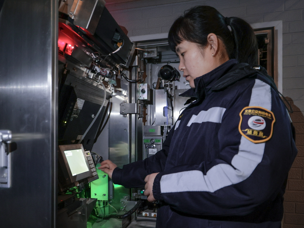 21:00,票务员段金娜正在各站的TVM自助售票机进行结账收款,收取纸币硬币。北京公交有轨电车西郊线 供图