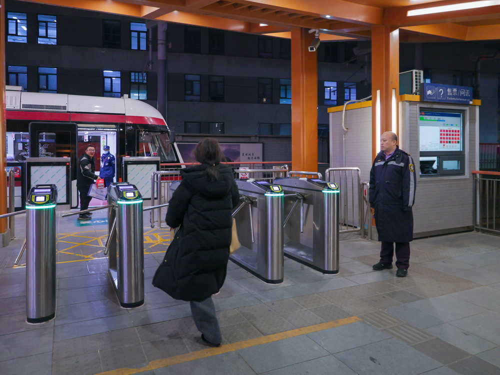 22:15末班车发车前,站务员范杰开启进站所有应急门为即将来不及购票上车的乘客提供“先乘车 出站补票”的便利。北京公交有轨电车西郊线 供图