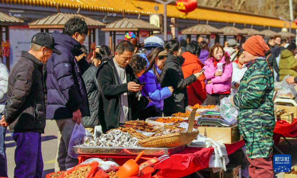 2月17日,游人在北京市平谷区丫髻山景区举办的传统庙会上购买农产品。