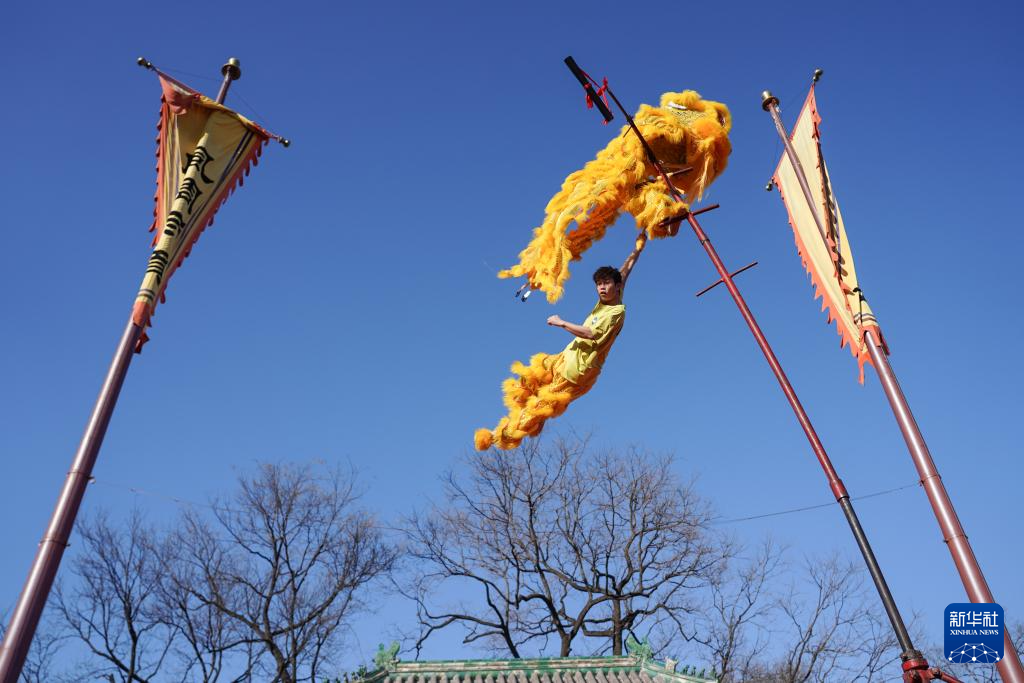 2月17日拍摄的东岳庙庙会中的狮舞演出。