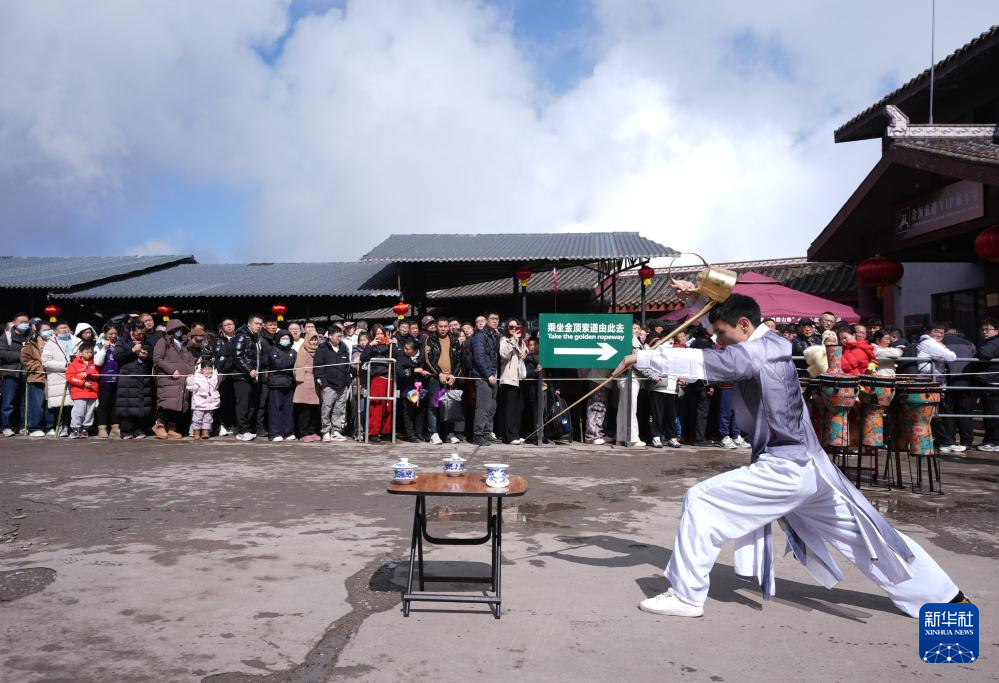 2月20日,在四川峨眉山景区的金顶索道排队处,四川峨眉山景区组织茶艺表演。
