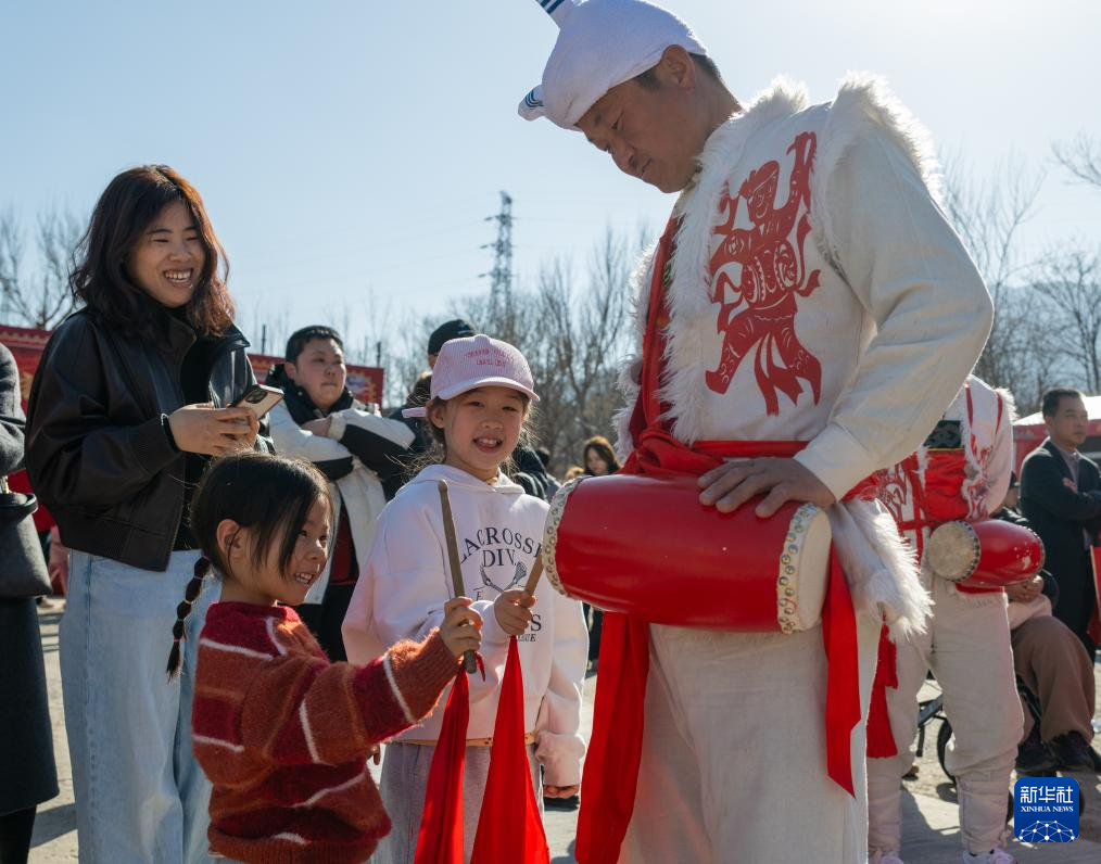 2月19日,在北京市海淀区凤凰岭第十三届新春非遗游园会上,小朋友与演出人员互动。