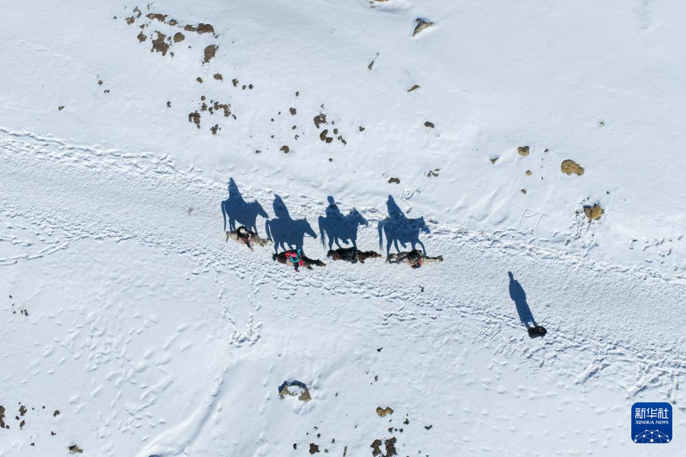 2月20日,游客在位于青海省海北藏族自治州门源回族自治县的岗什卡雪山体验骑马(无人机照片)。