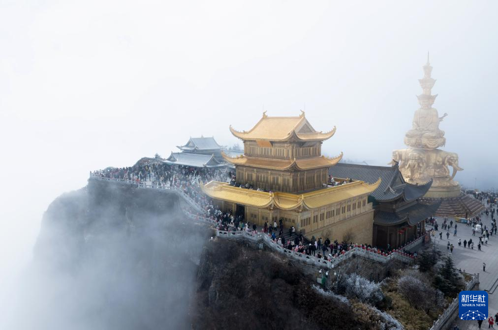 四川峨眉山景区的金顶,祥云翻涌,游人络绎不绝(2月20日无人机摄)。