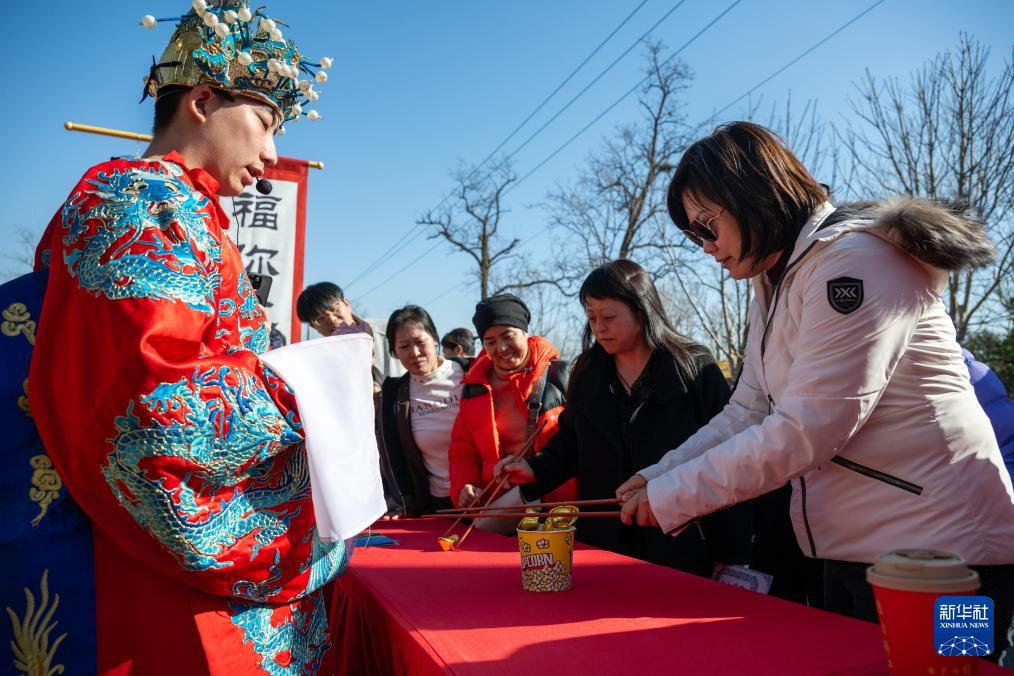 2月19日,在北京市海淀区凤凰岭第十三届新春非遗游园会上,游客与工作人员互动。