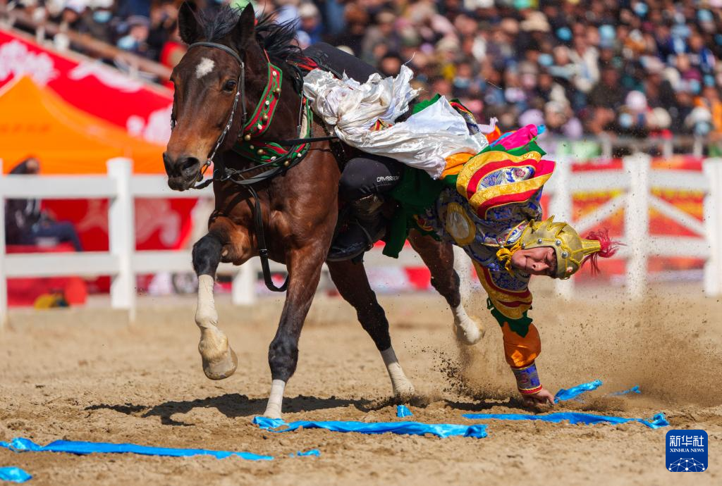 2月20日,马术队员在表演马上拾哈达。
