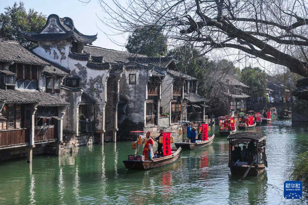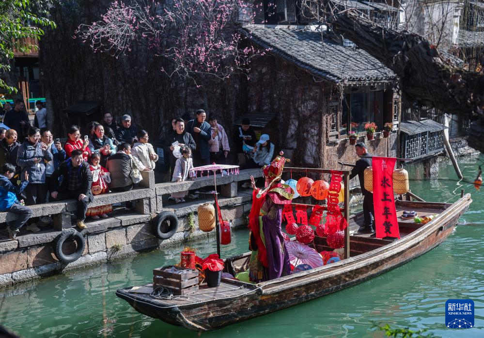 2月21日在乌镇景区内拍摄的福寿禧财水上巡游。