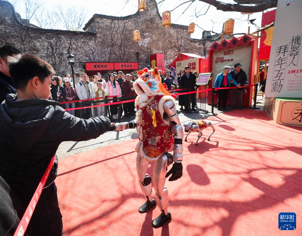2月21日在乌镇景区内拍摄的机器人拜年表演。