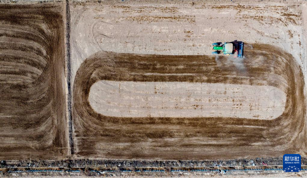 2月24日,在宁夏银川市贺兰县金贵镇银河村,农民驾驶旋耕机平整土地(无人机照片)。