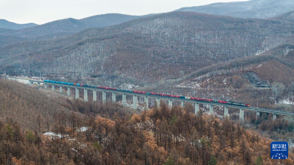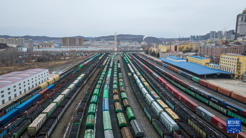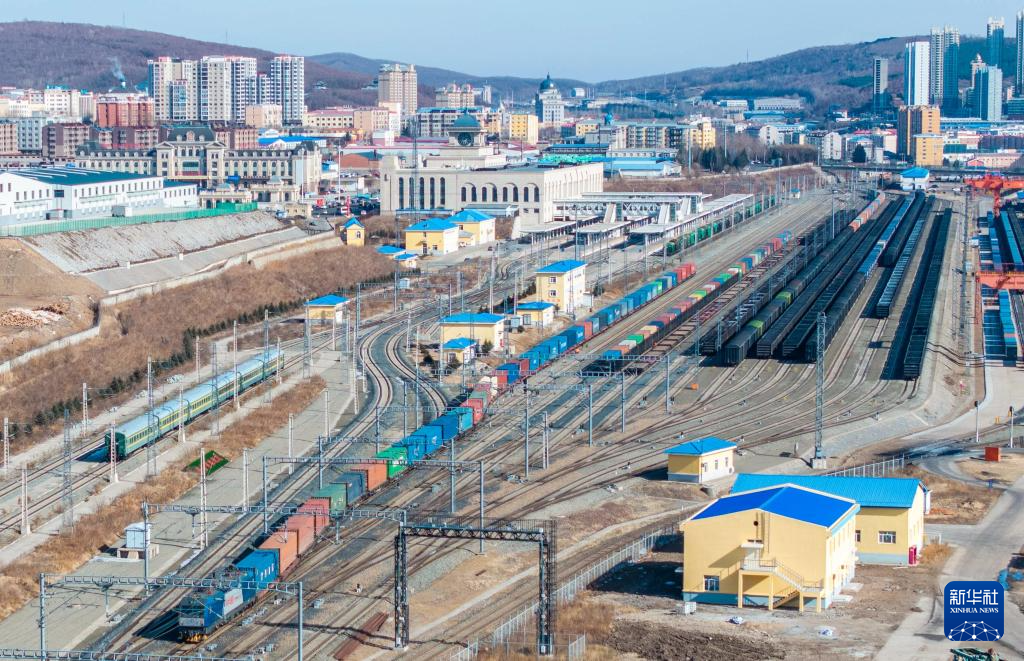 2月26日,满载货物的回程中欧班列驶入中国铁路哈尔滨局集团有限公司绥芬河站(无人机照片)。