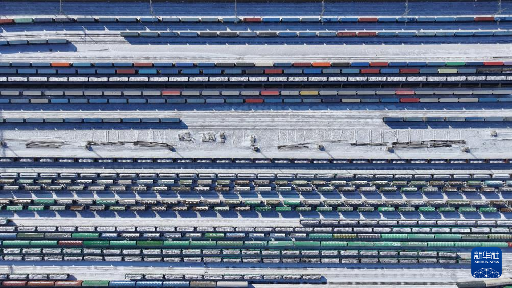 2月26日,回程中欧班列在中国铁路哈尔滨局集团有限公司绥芬河站南场等待解体换装(无人机照片)。