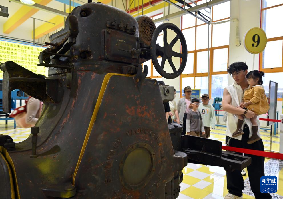 2月27日,市民、游客在椰树集团工厂参观20世纪50年代使用的真空封口机。