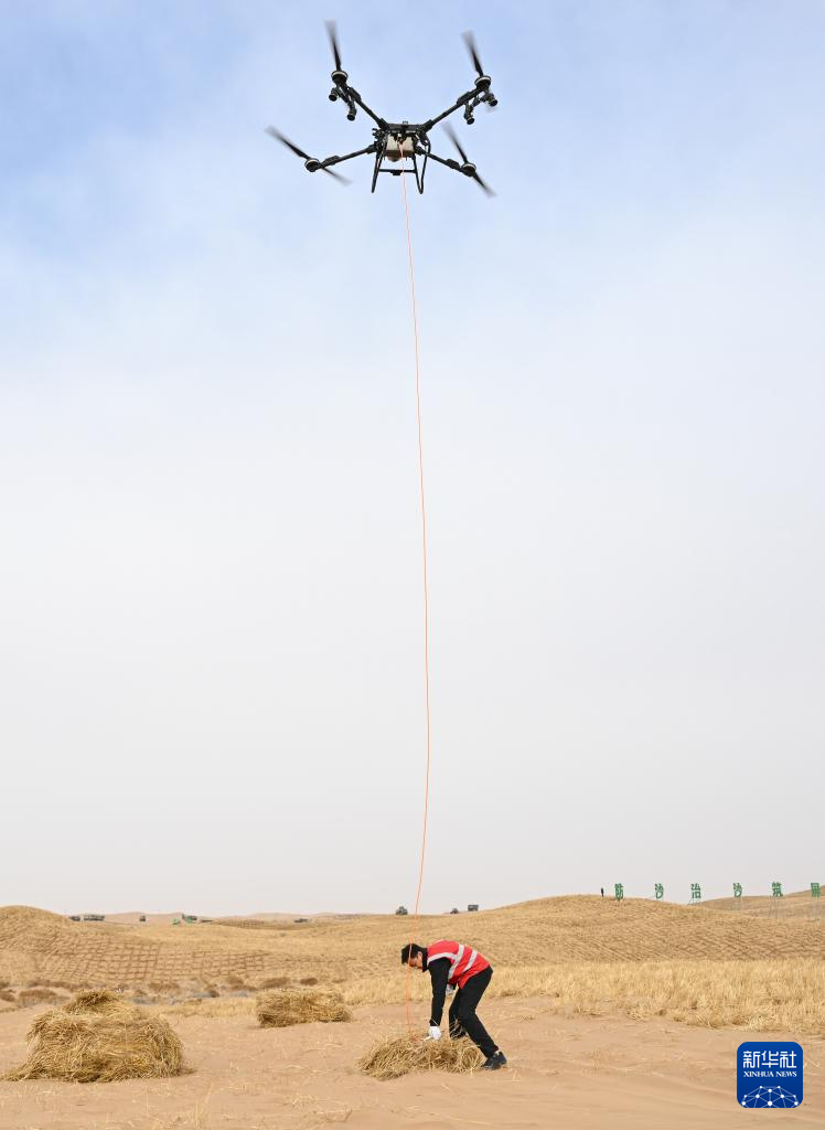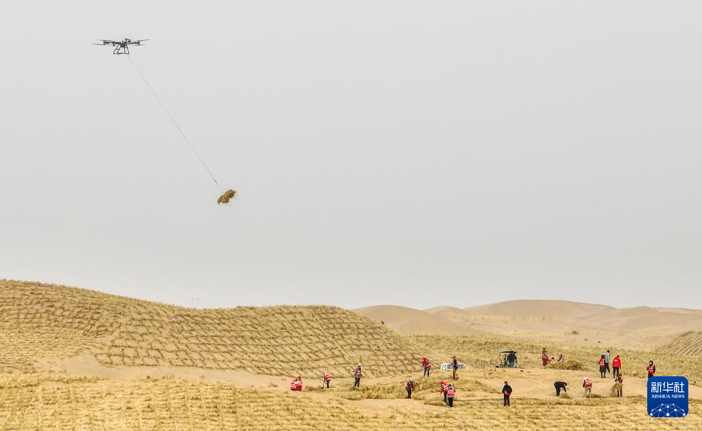 2月28日,工人在内蒙古阿拉善盟境内的乌兰布和沙漠接收无人机运送的草料。