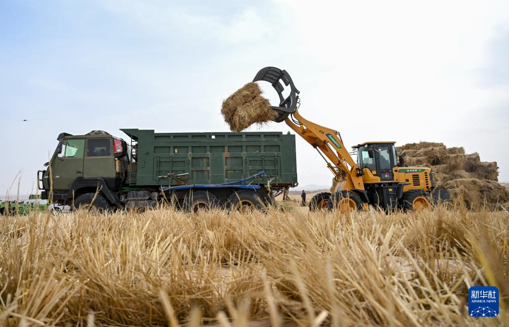 2月28日,大型机械在内蒙古阿拉善盟境内的乌兰布和沙漠装运草料。