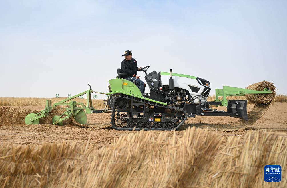 2月28日,工人在内蒙古阿拉善盟境内的乌兰布和沙漠驾驶小型履带沙障机作业。