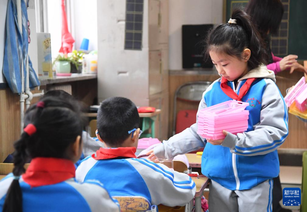 3月2日,在北京市平谷区第一小学,二年级(9)班的学生在课前发教具。