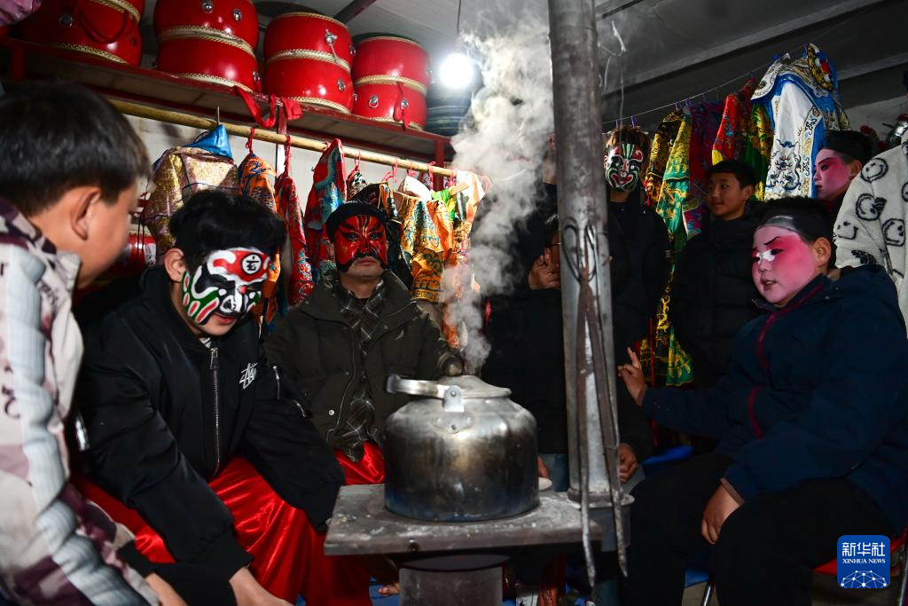3月2日,陇县黄花峪村社火队队员在相互交流。