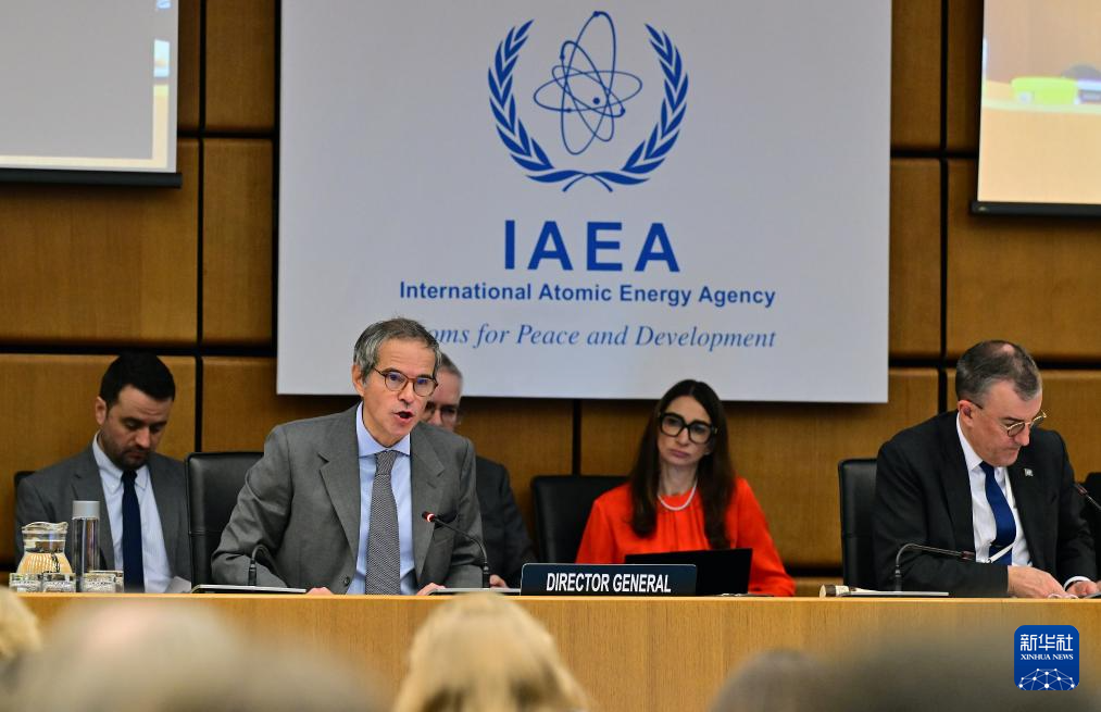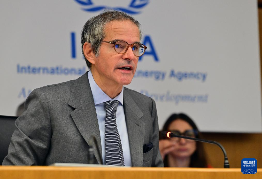 3月2日,在奥地利维也纳,国际原子能机构总干事格罗西(前左)在国际原子能机构理事会特别会议上讲话。