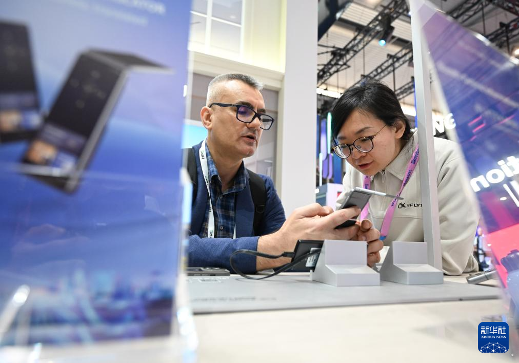 3月2日,在西班牙巴塞罗那,人们在科大讯飞展台体验翻译设备。