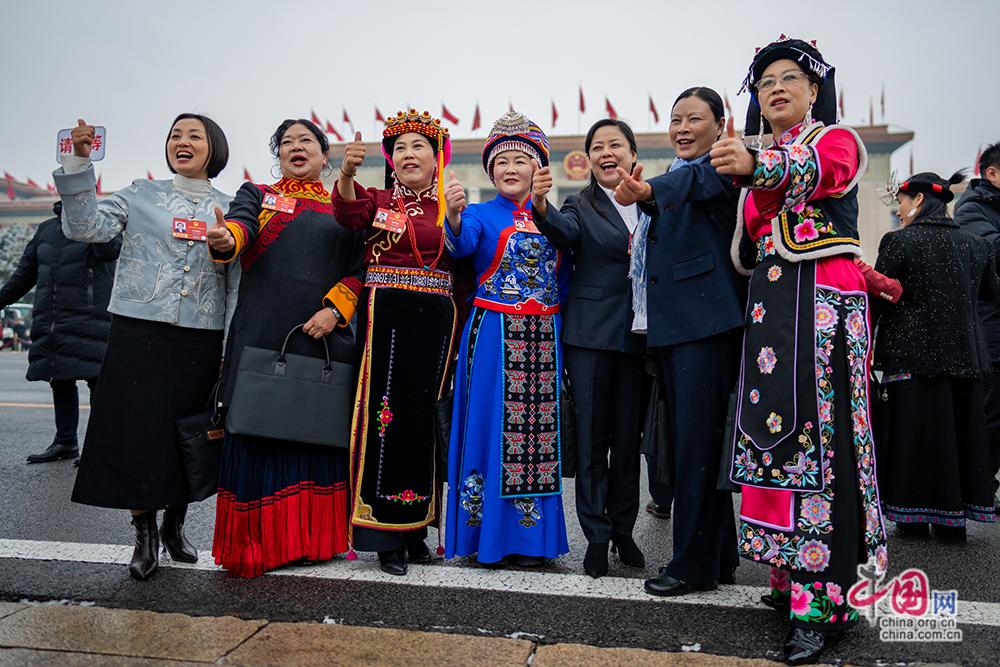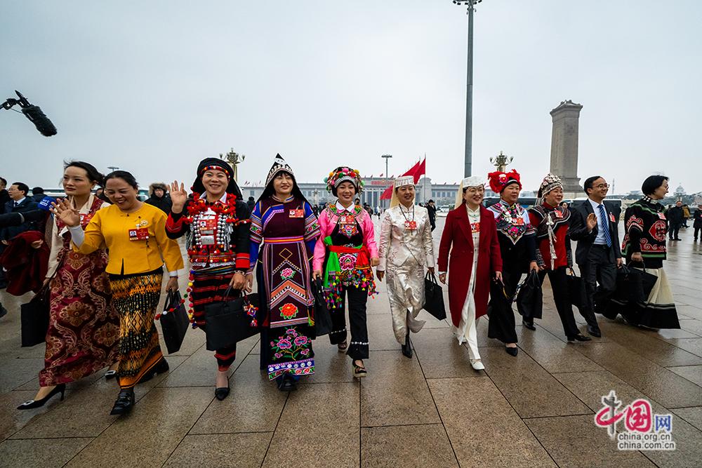 3月5日,十四届全国人大四次会议开幕会在北京人民大会堂举行。参会的少数民族代表集体步入大会堂。中国网记者 郑亮摄