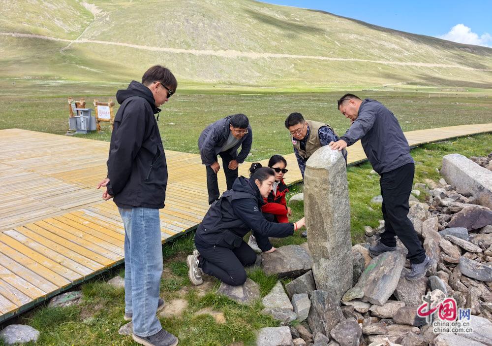 卓娅·巴合提与同事在野外查看石质文物。(受访者供图)