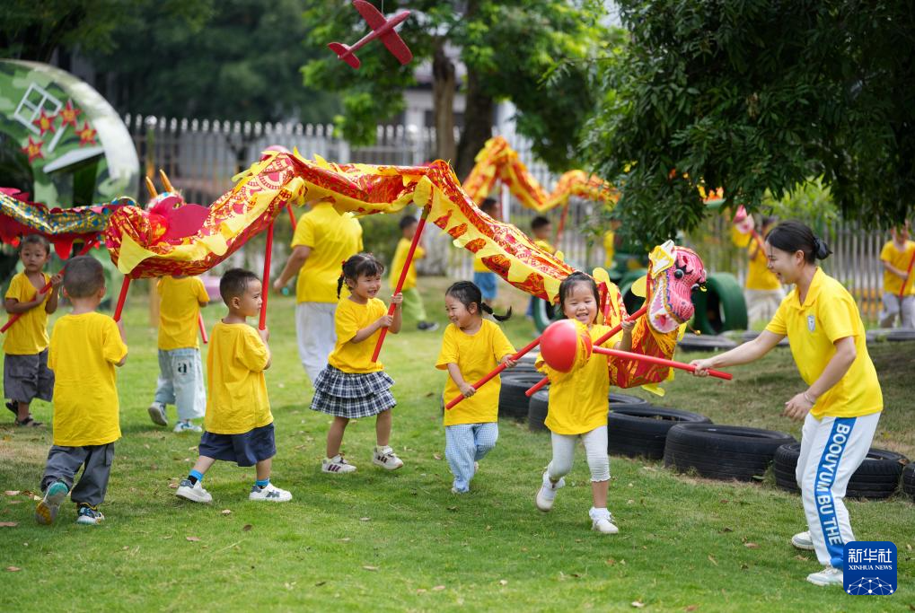 2025年9月5日,四川泸州白酒产业园区天骄托育园的老师带领孩子们舞龙。
