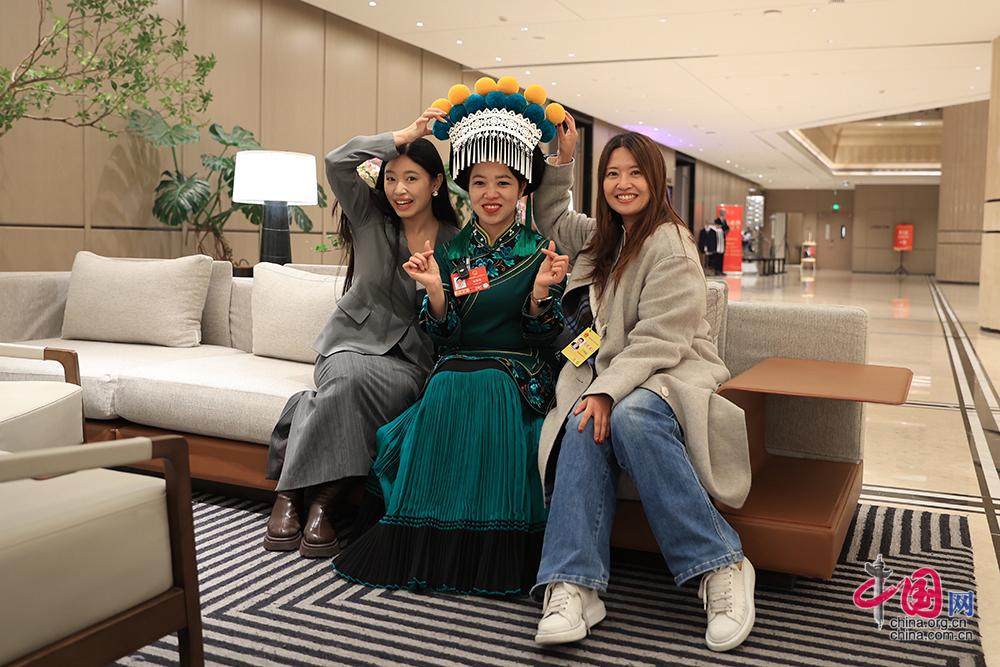 3月3日,中国网记者伦晓璇(右)、中国网记者孙菁(左)采访结束后与全国人大代表金瑞瑞(中)合影,展示彝族独特的民族服饰。中国网记者 郑亮摄