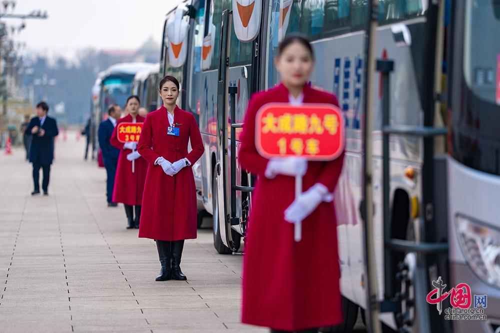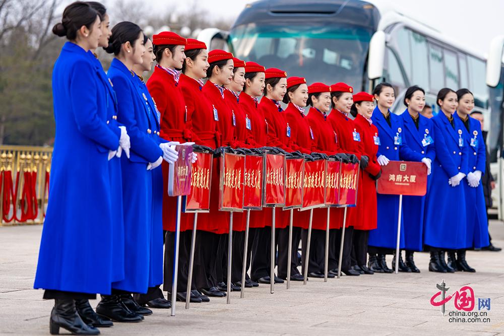3月7日,全国政协十四届四次会议举行第二次全体会议。来自驻地的服务人员在广场。中国网记者 郑亮摄