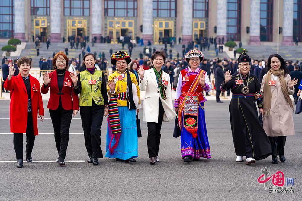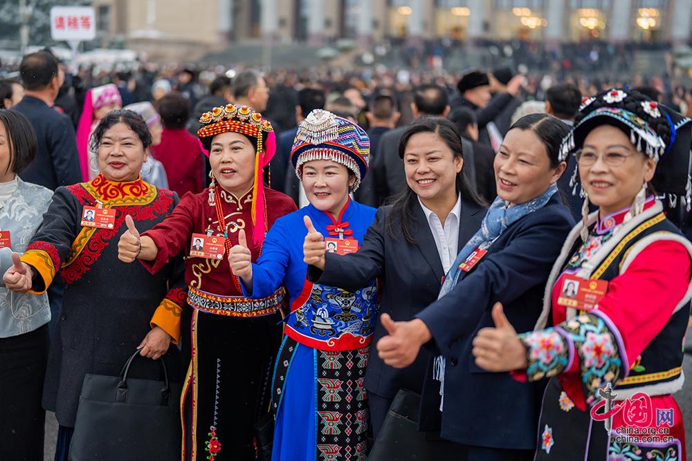3月7日,全国政协十四届四次会议举行第二次全体会议。参会的少数民族委员在大会堂前拍照留念。中国网记者 郑亮摄