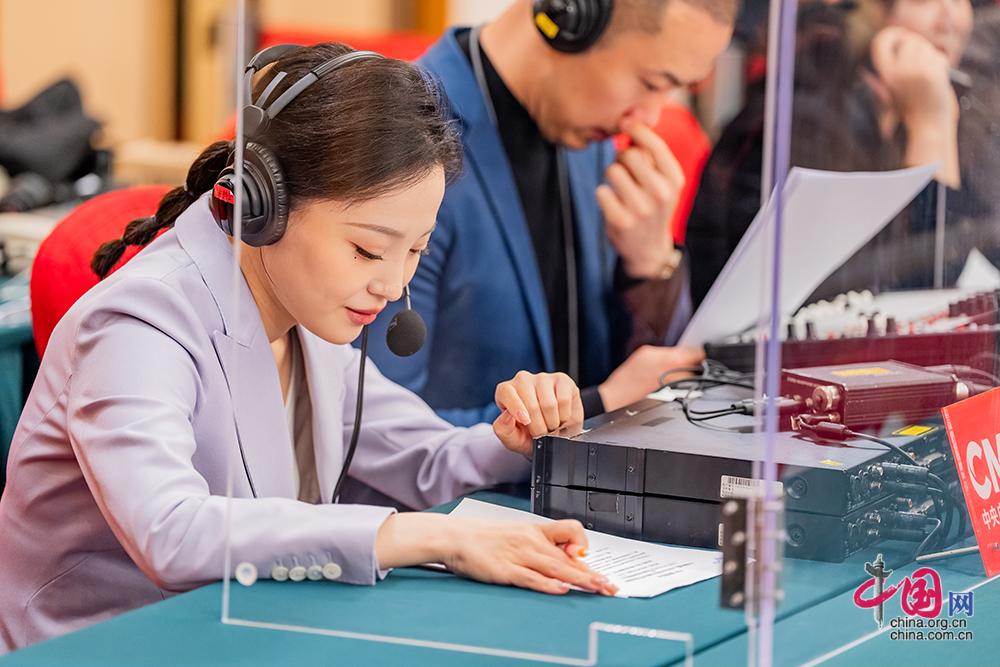 3月7日,十四届全国人大四次会议在梅地亚中心新闻发布厅举行民生主题记者会。现场翻译在进行会前准备。中国网记者 郑亮摄