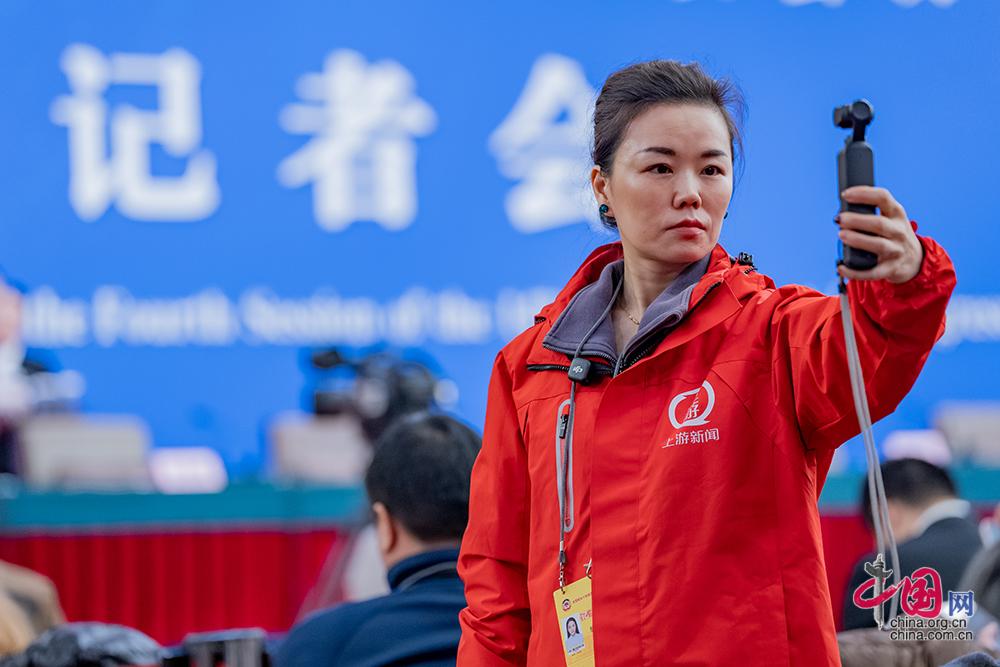 3月7日,十四届全国人大四次会议在梅地亚中心新闻发布厅举行民生主题记者会。一名记者在会前拍摄素材。中国网记者 郑亮摄