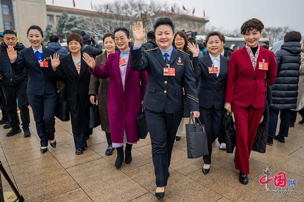 3月7日,全国政协十四届四次会议举行第二次全体会议。来自驻地的服务人员在广场合影留念。中国网记者 郑亮摄