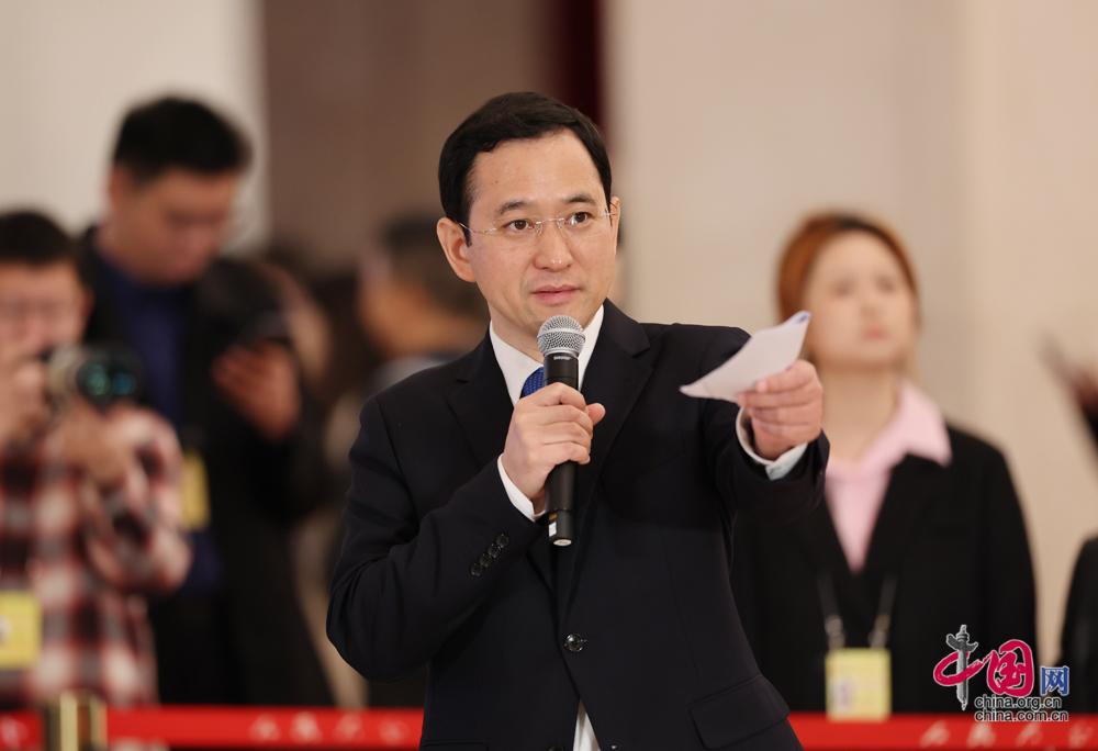 十四届全国人大四次会议新闻中心主任、全国人大常委会办公厅新闻局局长金晴中主持“代表通道”集中采访。中国网记者 董宁摄影