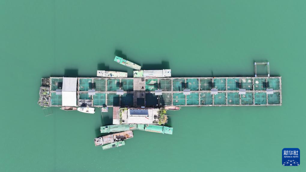 3月9日,重庆市万州区水产研究所大周基地工作人员在给鱼类喂食(无人机照片)。
