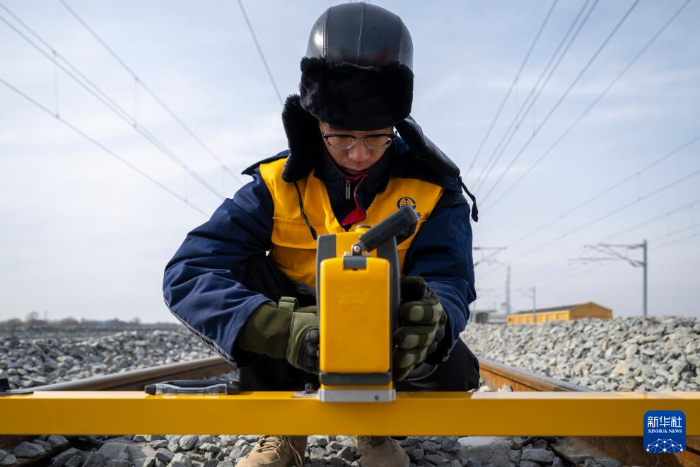 3月13日,工人在哈伊高铁绥化南站施工现场进行测量作业。